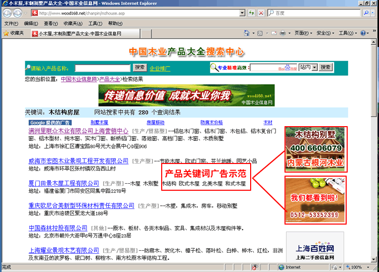 產(chǎn)品關(guān)鍵字廣告位于中國(guó)木業(yè)信息網(wǎng)核心欄目“產(chǎn)品大全”欄目中某一具體產(chǎn)品下,當(dāng)客戶點(diǎn)擊后,此產(chǎn)品目錄下的關(guān)鍵詞廣告將始終出現(xiàn)搜索內(nèi)容的右側(cè)。