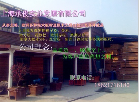 | 上海承俊實(shí)業(yè)發(fā)展有限公司成立于2008年,經(jīng)過幾年的不斷發(fā)展倉庫面積占地30000M2.專業(yè)從事北美、歐洲各種松木板材及原木之進(jìn)口加工及各種成品,大量批發(fā)俄羅斯樟子松、鐵杉、南方松、花旗松,歐洲赤松、澳洲云杉,加拿大松木SPF、紅雪松、新西蘭輻射松等多規(guī)格板材。《另有倉庫,太倉港,龍吳港》 供應(yīng)國內(nèi)眾多大型家具沙發(fā)木制品企業(yè),木門材料、包裝材料,防腐材料,園林綠化公司及木材貿(mào)易企業(yè)公司的長期穩(wěn)定供應(yīng)商。 另及市場大量需求并開發(fā)木材防腐部門:專業(yè)從事防腐木生產(chǎn)、銷售;戶外木結(jié)構(gòu)景觀設(shè)施;大型木結(jié)構(gòu)建筑及高檔住宅戶外的木裝飾、木制品的設(shè)計、小區(qū)景觀、木結(jié)構(gòu)獨(dú)立式住宅、(別墅)制作。 公司理念:品質(zhì)第一、顧客至上、為客戶提供理想之材。 |