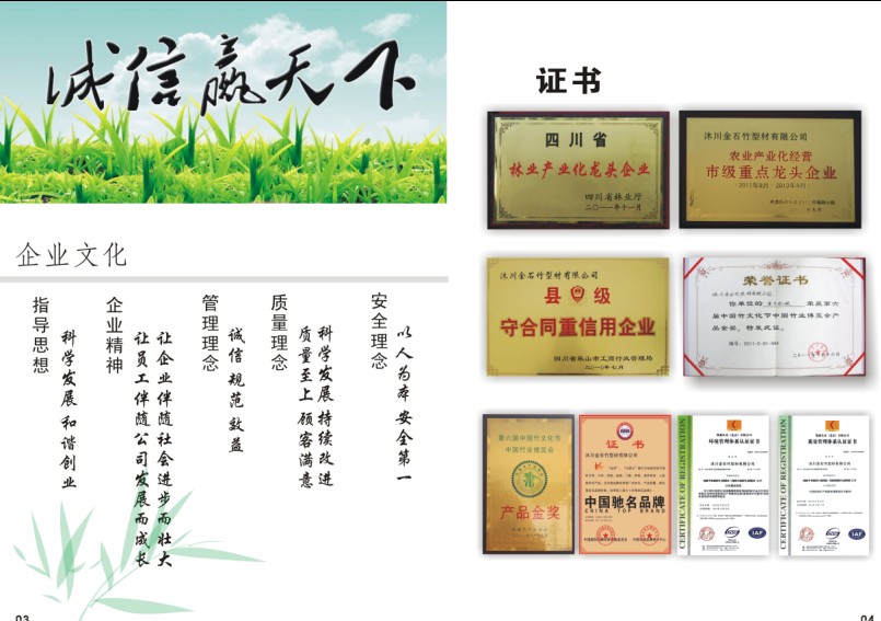 | 沐川金石竹型材有限公司地處中國二十大“竹鄉(xiāng)”之一的四川省沐川縣,是一家從事竹制品生產(chǎn)、設計、加工經(jīng)營的國有企業(yè)。公司擁有員工400余人,占地200畝,系四川省林業(yè)產(chǎn)業(yè)化龍頭企業(yè)。 公司依托“竹鄉(xiāng)”本地豐富的竹木資源條件和當?shù)卣拇罅Ψ龀,結合公司10萬畝竹木基地林地建設,形成了“營林-設計-加工”一體化的經(jīng)營模式。公司生產(chǎn)工藝先進,擁有主廠房面積40000平方米,七條成套設備流水生產(chǎn)線,主要生產(chǎn)重竹型材、集裝箱板、覆面竹編膠合板、火車廂底板、竹地板、戶外地板等!般逶创ㄅ啤毕盗兄裥停ò澹┊a(chǎn)品通過了ISO9001,ISO14001管理體系認證和FSC森林認證,其重竹地板榮獲了“第六屆中國竹文化節(jié)中國竹業(yè)博覽會產(chǎn)品金獎”。高性能重竹材特別適用于高檔別墅、室內(nèi)外裝飾、工藝雕刻、仿古家具、傳統(tǒng)名俗建筑等眾多領域,產(chǎn)品綠色低碳、環(huán)保,深受客戶青睞。 公司堅持以顧客為關注焦點,堅持以質(zhì)量為中心,與四川林業(yè)科學研究院、四川大學高分子研究所進行合作研發(fā),配備專業(yè)的設計團隊為客戶服務。 傳承文化,融入潮流,健康綠色,體貼溫馨是我們不斷的追求。 您的認可就是我們的自信,您的滿意就是我們的動力!誠邀您的加盟! |