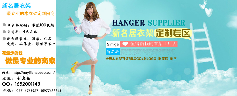 2013年,新名居衣架重點(diǎn)發(fā)展木衣架定制業(yè)務(wù),面向全國(guó)及海外市場(chǎng),針對(duì)服裝店、酒店、賓館及商務(wù)禮品客戶,提供從幾十支到上千只支數(shù)量任選的實(shí)木衣架定制訂制服務(wù),包括木衣架刻LOGO、刻字、刻商標(biāo)。依據(jù)訂貨數(shù)量,2天至7天即可發(fā)貨。具體款式可登陸淘寶網(wǎng)店(新名居衣架旗艦店http://nnyijia.taobao.com/)進(jìn)行選擇。新名居衣架旗艦店刻字刻LOGO定制流程: