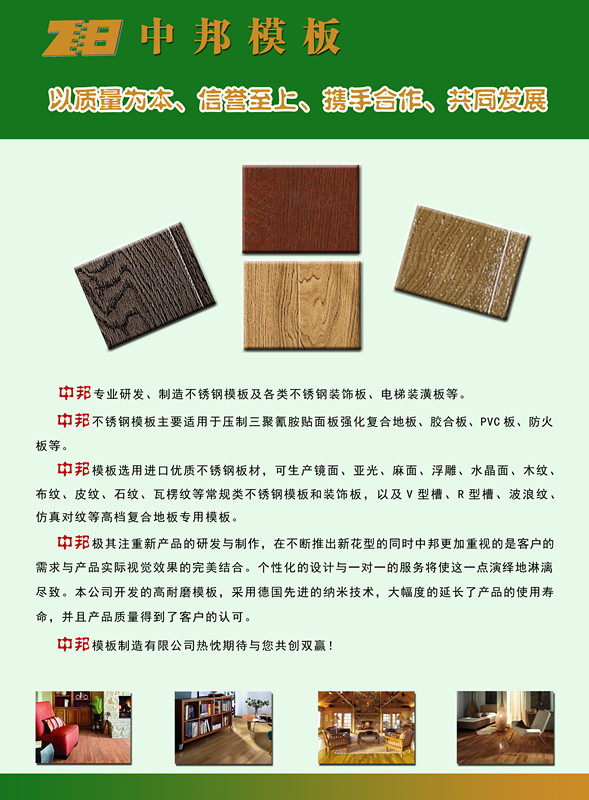 丹陽市中邦模板制造有限公司坐落在丹陽市南郊,地理位置優(yōu)越,交通便捷,是一家專業(yè)從事不銹鋼模板的開發(fā)、制造和修復的生產(chǎn)廠家。公司的產(chǎn)品常規(guī)系列有:浮雕模板、水晶模板、麻面模板、象形紋模板、異性槽模板等。公司也可根據(jù)客戶來樣或需求設計、制作各種花紋的模板。 公司有一流的電鍍硬格生產(chǎn)線,從事不銹鋼模板修復多年,有著豐富的理論和實踐技能,使修復的鋼板鉻層硬度更高,模板的光澤度控制更精確。 本公司將秉承“質(zhì)量第一,服務第一,信譽第一”的宗旨和“誠信、務實、創(chuàng)新”的經(jīng)營理念,為客戶提供最優(yōu)質(zhì)的服務。真誠期待于您的合作! |