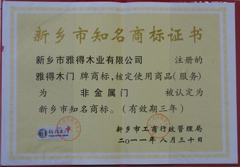【雅得木門】榮獲“新鄉(xiāng)市知名商標”品牌證書-河南雅得木業(yè)有限公司