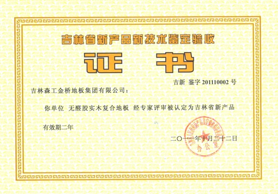 2011年10月22日,吉林省林業(yè)廳受工信廳的委托,組織專家對金橋地板集團公司開發(fā)的“無醛膠實木復(fù)合地板”進行了鑒定。吉林省人民政府新產(chǎn)品鑒定驗收指導(dǎo)委員會辦公室以吉新鑒字201110002號證書正式認定金橋地板集團開發(fā)生產(chǎn)的“無醛膠實木復(fù)合地板”為吉林省新產(chǎn)品。該產(chǎn)品使用水性異氰酸酯無醛膠粘劑,通過采用預(yù)熱涂膠、二次冷壓膠合的先進工藝,徹底解決了實木復(fù)合地板甲醛釋放的問題,甲醛釋放量≤0.3毫克/升(相當于天然木材含甲醛量),達到了綠色環(huán)保要求,迎合了國內(nèi)外健康環(huán)保的家居消費趨勢,對于開發(fā)國際國內(nèi)市場將起到巨大的推進作用。吉林森工金橋地板集團已成為國內(nèi)首家可以大規(guī)模生產(chǎn)無醛膠地板的企業(yè)。 “吉林森工金橋地板集團無醛膠實木復(fù)合地板技術(shù)研究”被吉林省科學(xué)技術(shù)廳確認登記為吉林省科技成果(證書編號2011365)。