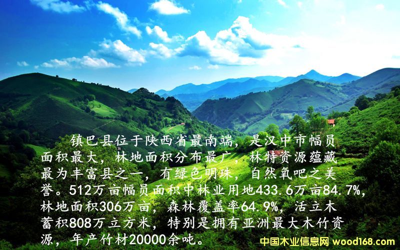 鎮(zhèn)巴縣位于陜西省最南端,是漢中市幅員面積最大,林地面積分布最廣,林特資源蘊(yùn)藏最為豐富縣之一,有綠色明珠,自然氧吧之美譽(yù)。512萬畝幅員面積中林業(yè)用地433.6萬畝占84.7%,林地面積306萬畝,森林覆蓋率64.9%,活立木蓄積808萬立方米,特別是擁有亞洲最大木竹資源,年產(chǎn)竹材20000余噸。