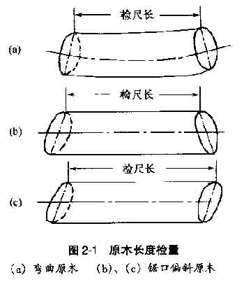 。1)長度檢量 、贆z量方法:長度檢量是在原木小頭斷面至大頭斷面之間相距最短處取直檢量。檢量時,量至厘米,不足厘米者四舍五入取整。 檢量彎曲原木、鋸口偏斜原木的長度時,均是量取兩頭斷面間的最小距離(圖2-l)。